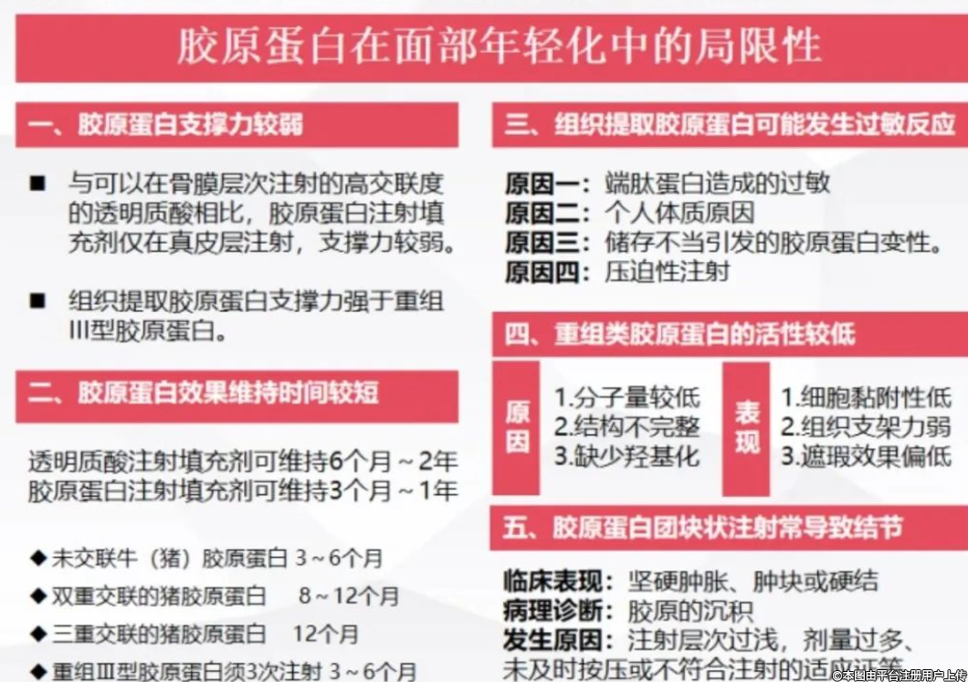 沒(méi)有材料是全能的,膠原蛋白注射填充劑的應(yīng)用過(guò)程中也出現(xiàn)了一些問(wèn)題,今天來(lái)聊一聊膠原蛋白在面部年輕化中的局限性,下面將從5個(gè)方面和大家展開(kāi)分享。