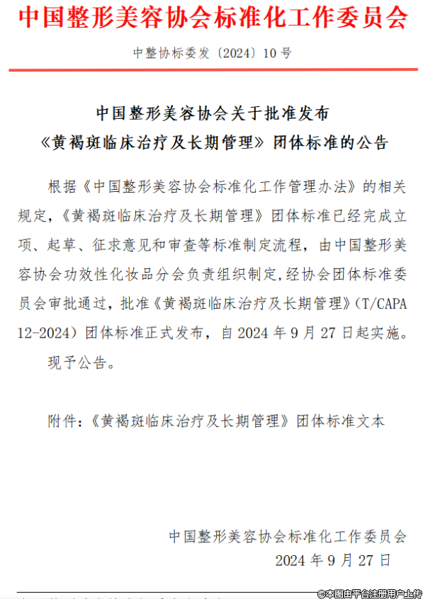 《黃褐斑臨床治療及長期管理》團(tuán)體標(biāo)準(zhǔn)的公告根據(jù)《中國整形美容協(xié)會(huì)標(biāo)準(zhǔn)化工作管理辦法》的相關(guān)規(guī)定,《黃褐斑臨床治療及長期管理》團(tuán)體標(biāo)準(zhǔn)已經(jīng)完成立項(xiàng)、起草、征求意見和審查等標(biāo)準(zhǔn)制定流程,由中國整形美容協(xié)會(huì)功效性化妝品分會(huì)負(fù)責(zé)組織制定,經(jīng)協(xié)會(huì)團(tuán)體標(biāo)準(zhǔn)委員會(huì)審批通過,批準(zhǔn)《黃褐斑臨床治療及長期管理》(T/CAPA12-2024)團(tuán)體標(biāo)準(zhǔn)正式發(fā)布,自2024年9月27日起實(shí)施。