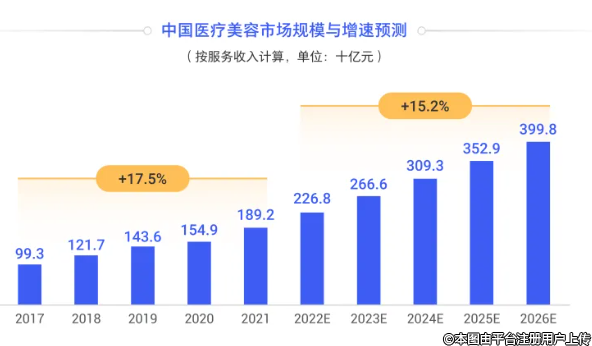 數(shù)據(jù)顯示,中國醫(yī)療美容市場自2017年起,以每年17.5%的符合增長率增長至2021年的近1,900億規(guī)模,而從2022年起,預計后續(xù)增長稍有放緩,以每年15.2%的復合增長率持續(xù)增長,呈現(xiàn)預計2023年全年市場規(guī)模將達2,666億元,預計2026年整個醫(yī)美市場將達到近4,000億的市場規(guī)模。