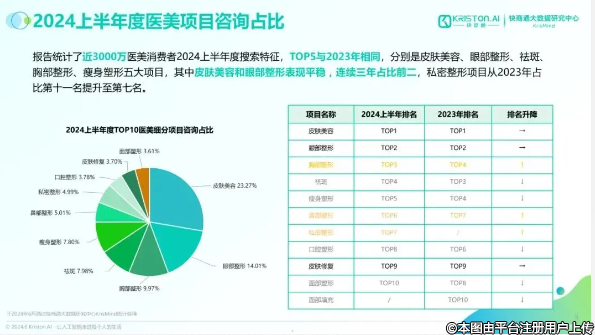 據(jù)2024上半年度醫(yī)美項目咨詢占比情況,在對近3000萬醫(yī)美消費者進行統(tǒng)計后發(fā)現(xiàn),“皮膚美容”已連續(xù)3年占據(jù)搜索榜單第一名。