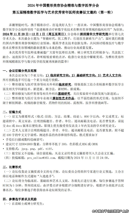 2024年中國整形美容協(xié)會(huì)精準(zhǔn)與數(shù)字醫(yī)學(xué)分會(huì)第五屆精準(zhǔn)數(shù)字醫(yī)學(xué)與藝術(shù)優(yōu)秀青年醫(yī)師競賽征文邀約(第一輪)弄潮智能時(shí)代,攜手精準(zhǔn)診療,打造美好人生!一直以來,中國整形美容協(xié)會(huì)精準(zhǔn)與數(shù)字醫(yī)學(xué)分會(huì)始終堅(jiān)持“促進(jìn)精準(zhǔn)診療和數(shù)字化技術(shù)在整形美容領(lǐng)域的臨床應(yīng)用”為宗旨。2024年11月29日—12月1日(周五至周日)分會(huì)將在深圳清華大學(xué)研究院舉行第七次學(xué)術(shù)大會(huì),本次盛會(huì)主題為“智能時(shí)代、醫(yī)工攜手,打造醫(yī)美新質(zhì)生產(chǎn)力”,屆時(shí)我們將邀約國內(nèi)外整形美容領(lǐng)域的行業(yè)領(lǐng)袖、精英學(xué)者及技術(shù)創(chuàng)新先鋒,共同探討精準(zhǔn)醫(yī)療與數(shù)字技術(shù)在整形美容領(lǐng)域的最新進(jìn)展與未來趨勢(shì),推動(dòng)行業(yè)高質(zhì)量發(fā)展。本次優(yōu)秀青年醫(yī)師競賽誠邀廣大青年醫(yī)師以及博、碩士研究生們積極參與,關(guān)注醫(yī)工融合,逐鹿醫(yī)學(xué)與藝術(shù),聆聽精銳前輩的點(diǎn)評(píng),收獲行業(yè)競技中耀眼獎(jiǎng)項(xiàng),為整形美容外科領(lǐng)域精準(zhǔn)醫(yī)學(xué)與數(shù)字醫(yī)學(xué)的發(fā)展再續(xù)新的篇章!1會(huì)議征稿分類及范圍