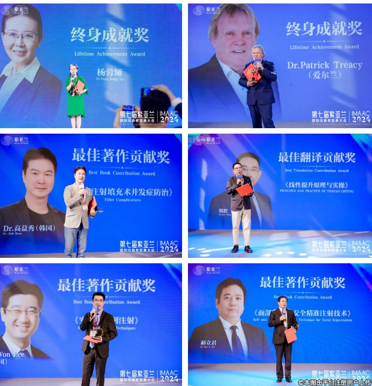 活動(dòng)現(xiàn)場,楊蓉婭教授、俄羅斯Dr./Prof. Natalia Manturova、俄羅斯Dr.Akhmed Rakhimov、愛爾蘭Dr.Patrick Treacy榮獲“終身成就獎(jiǎng)”,郝立君教授、楊高云教授、德國Dr.Bernd Kleine Gunk等榮獲“最佳著作貢獻(xiàn)獎(jiǎng)”,羅盛康教授、吳曉軍教授等榮獲“最佳翻譯貢獻(xiàn)獎(jiǎng)”。他們的成就不僅體現(xiàn)在醫(yī)美領(lǐng)域的學(xué)術(shù)貢獻(xiàn)上,更在于通過著書立說,推動(dòng)了醫(yī)美知識的普及與技術(shù)的進(jìn)步,為全球醫(yī)美行業(yè)的發(fā)展注入了源源不斷的動(dòng)力。