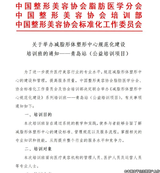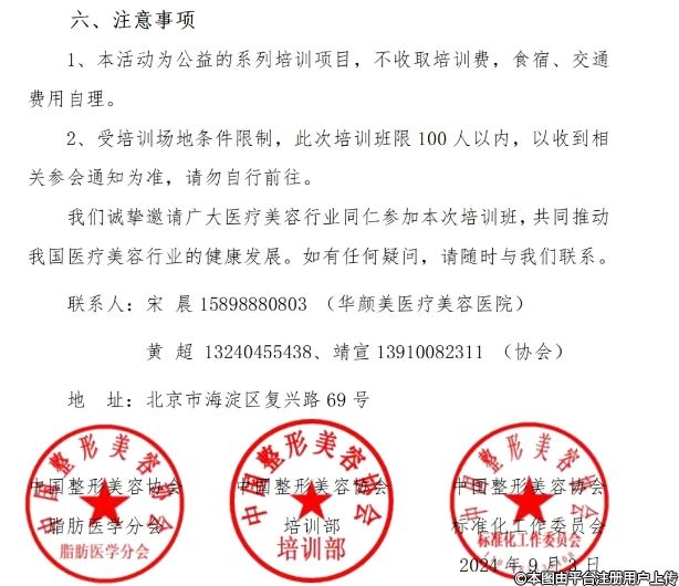 2、受培訓(xùn)場地條件限制,此次培訓(xùn)班限100人以內(nèi),以收到相關(guān)參會通知為準(zhǔn),請勿自行前往。我們誠摯邀請廣大醫(yī)療美容行業(yè)同仁參加本次培訓(xùn)班,共同推動我國醫(yī)療美容行業(yè)的健康發(fā)展。如有任何疑問,請隨時與我們聯(lián)系。