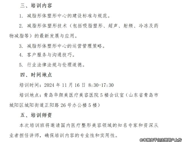 培訓(xùn)時間:2024年11月16日8:30-17:30培訓(xùn)地點(diǎn):青島華顏美醫(yī)療美容醫(yī)院5樓會議室(山東省青島市城陽區(qū)城陽街道正陽路 26 號辦公樓5樓)五、培訓(xùn)師資