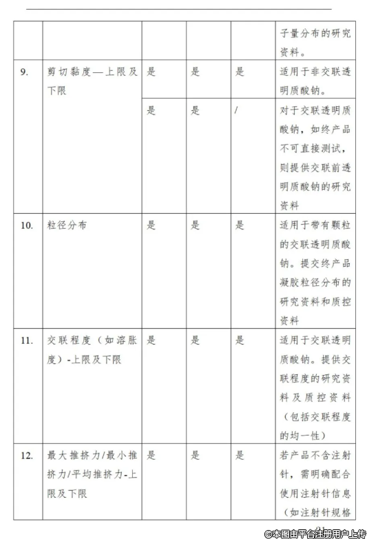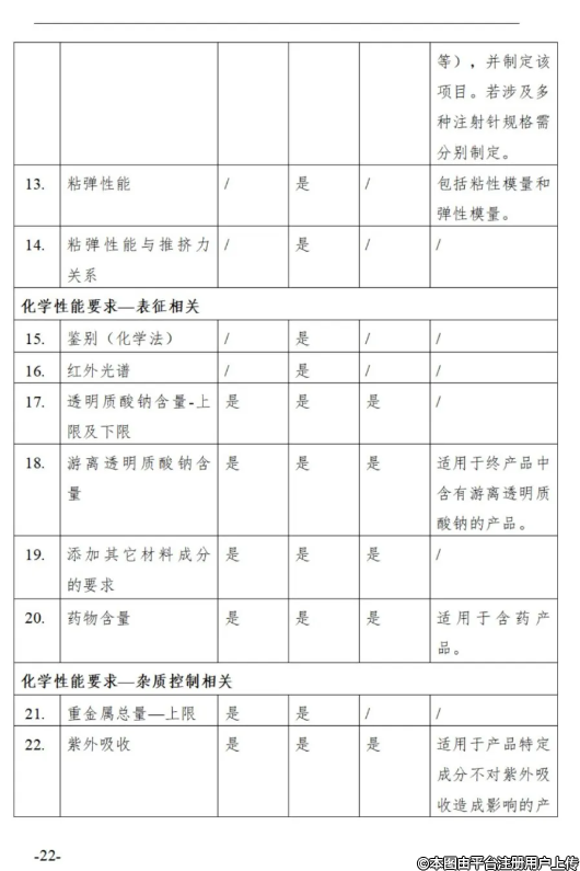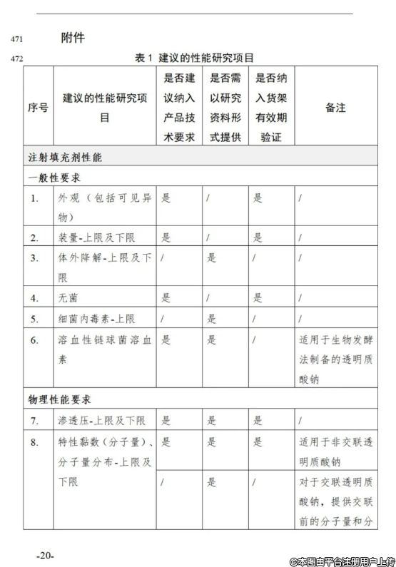 3.3對(duì)于整形美容用透明質(zhì)酸鈉類注射填充劑,性能研究項(xiàng)目包括但不限于附件表1中所列項(xiàng)目。注冊(cè)申請(qǐng)人需根據(jù)具體產(chǎn)品特性,考慮增加其他適用的性能研究項(xiàng)目。對(duì)于附件表格列舉的項(xiàng)目中,如有不適用項(xiàng),亦需說(shuō)明具體理由。性能研究宜采用終產(chǎn)品,選擇典型型號(hào)規(guī)格。如受試驗(yàn)條件等因素影響,未使用終產(chǎn)品時(shí),需提供合理性分析,確認(rèn)未對(duì)試驗(yàn)結(jié)果及結(jié)論產(chǎn)生影響。研究項(xiàng)目所用樣本數(shù)量宜適當(dāng),說(shuō)明樣本數(shù)量的確定依據(jù)。適用時(shí)對(duì)驗(yàn)證結(jié)果進(jìn)行統(tǒng)計(jì)學(xué)分析。