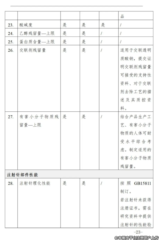 產(chǎn)品技術(shù)要求中無(wú)需制定灌封填充劑前空注射器的性能項(xiàng)目,應(yīng)針對(duì)裝有注射填充劑的注射器部件制定適用的性能項(xiàng)目。