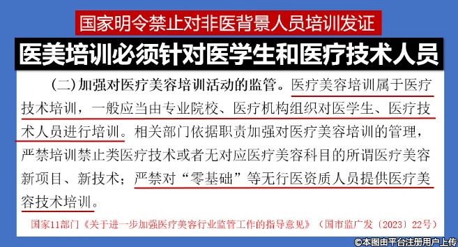 “相應(yīng)醫(yī)師資質(zhì)”是指具有醫(yī)療美容相關(guān)專業(yè)的執(zhí)業(yè)醫(yī)師資格證等;“相應(yīng)醫(yī)學(xué)藥學(xué)知識”是指具有國家認(rèn)可的醫(yī)學(xué)類學(xué)歷、美容醫(yī)學(xué)專業(yè)培訓(xùn)等證書。目前任何單位頒發(fā)的美學(xué)設(shè)計師或醫(yī)美咨詢師證書只能作為職業(yè)能力培訓(xùn)證明,并非合法從業(yè)資質(zhì)。而且根據(jù)國家11部門監(jiān)管規(guī)定,其培訓(xùn)對象也必須具備醫(yī)學(xué)背景,否則其培訓(xùn)活動屬違規(guī)行為!
