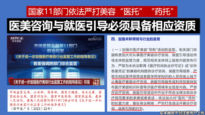根據(jù)國家11部門監(jiān)管要求,從事醫(yī)美咨詢與就醫(yī)引導(dǎo)服務(wù),必須具備相應(yīng)醫(yī)師資質(zhì)或者相應(yīng)醫(yī)學(xué)藥學(xué)知識,否則就是國家要依法嚴(yán)厲打擊的“醫(yī)托”“藥托”!因此,相關(guān)從業(yè)人員必須具備可供查驗的相應(yīng)資質(zhì)。
