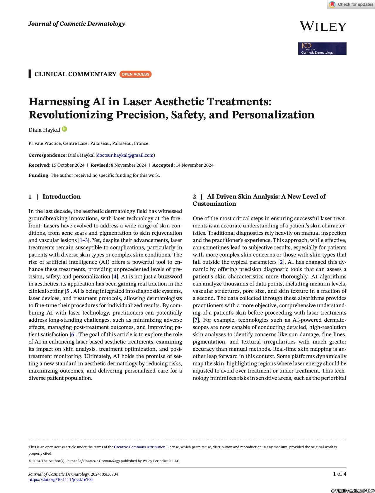 過(guò)去十年間,美容皮膚科領(lǐng)域因激光技術(shù)的創(chuàng)新而發(fā)生了顯著變革,激光技術(shù)始終處于該領(lǐng)域發(fā)展的前沿。激光已逐漸發(fā)展成為一種能夠有效治療多種皮膚狀況的手段,其應(yīng)用范圍涵蓋了從痤瘡疤痕、色素沉著到皮膚年輕化以及血管病變等諸多方面。雖然激光技術(shù)取得了長(zhǎng)足的進(jìn)步,但在實(shí)際應(yīng)用中,激光治療并非毫無(wú)風(fēng)險(xiǎn),尤其是在面對(duì)皮膚類(lèi)型各異或者皮膚狀況較為復(fù)雜的患者時(shí),仍然容易出現(xiàn)各種并發(fā)癥。人工智能(AI)技術(shù)的興起,為改善激光治療效果提供了一種極具潛力的強(qiáng)大工具。AI 技術(shù)的應(yīng)用能夠在激光治療過(guò)程中提供前所未有的高精度、高安全性以及高度個(gè)體化的治療方案。如今在醫(yī)美領(lǐng)域,人工智能已經(jīng)不再只是一個(gè)熱門(mén)的流行詞匯,其在臨床實(shí)踐中的應(yīng)用正逐漸獲得實(shí)質(zhì)性的進(jìn)展和廣泛的認(rèn)可。目前,人工智能技術(shù)正在逐步融入到診斷系統(tǒng)、激光設(shè)備以及治療方案等各個(gè)環(huán)節(jié)之中,這使得醫(yī)生能夠更加精細(xì)地調(diào)整治療程序,為每一位患者提供更加個(gè)體化的治療結(jié)果。將人工智能技術(shù)與激光技術(shù)結(jié)合,有望克服激光治療長(zhǎng)期面臨的諸多挑戰(zhàn),例如如何最大程度地減少治療過(guò)程中的不良反應(yīng)、如何更加有效地管理治療后的效果以及如何顯著提高患者對(duì)治療的滿意度等。本文旨在深入探討人工智能技術(shù)在提升激光美容治療效果方面可能發(fā)揮的重要作用,詳細(xì)論述其對(duì)皮膚分析、治療優(yōu)化以及治療后監(jiān)測(cè)等環(huán)節(jié)的深遠(yuǎn)影響。人工智能技術(shù)有望通過(guò)降低治療風(fēng)險(xiǎn)、最大化治療效果以及為不同患者群體提供更加個(gè)性化的護(hù)理服務(wù),在美容皮膚治療領(lǐng)域樹(shù)立全新標(biāo)準(zhǔn)。