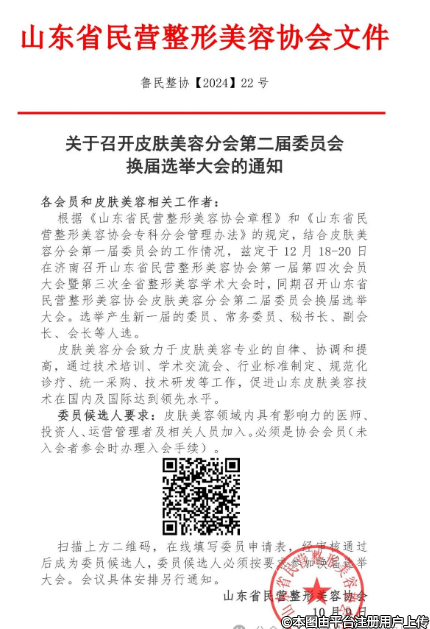 根據(jù)《山東省民營整形美容協(xié)會章程》和《山東省民營整形美容協(xié)會??品謺芾磙k法》的規(guī)定,結(jié)合皮膚美容分會第一屆委員會的工作情況,茲定于12月18-20日在濟(jì)南召開山東省民營整形美容協(xié)會第一屆第四次會員大會暨第三次全省整形美容學(xué)術(shù)大會時,同期召開山東省民營整形美容協(xié)會皮膚美容分會第二屆委員會換屆選舉大會。選舉產(chǎn)生新一屆的委員、常務(wù)委員、秘書長、副會長、會長等人選。