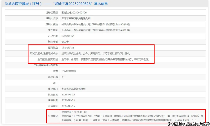 湖南省藥品監(jiān)督管理局(以下簡(jiǎn)稱“湖南省藥監(jiān)局”)對(duì)湖南省內(nèi)6家企業(yè)生產(chǎn)的7款超聲治療儀注冊(cè)證進(jìn)行了重要調(diào)整,刪去了這些產(chǎn)品適用范圍中原有的“用于醫(yī)療機(jī)構(gòu)康復(fù)科、皮膚科、整形美容科”的表述,僅限定適用于人體肩頸、腰腹部及四肢部位慢性組織損傷疼痛(部分產(chǎn)品還可用于皮膚瘢痕、神經(jīng)性皮炎)的輔助治療。