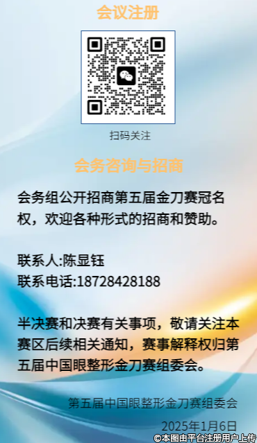 3、全國(guó)總決賽規(guī)則總決賽時(shí)間初步定于2025年9~10月在北京舉行:每個(gè)半決賽區(qū)晉級(jí)單位和個(gè)人(共15名醫(yī)生),在規(guī)定的時(shí)間,在注冊(cè)執(zhí)業(yè)地點(diǎn),將比賽手術(shù)實(shí)況視頻向大會(huì)輸出,會(huì)場(chǎng)大屏直播手術(shù)視頻,由會(huì)場(chǎng)專家評(píng)委和參會(huì)醫(yī)生評(píng)委,采用共同現(xiàn)場(chǎng)評(píng)分方法,依據(jù)得分高低排序,評(píng)選出2025年度中國(guó)眼整形金刀賽金刀獎(jiǎng),同時(shí)評(píng)選出全國(guó)眼整形優(yōu)勝單位和個(gè)人,并頒發(fā)獎(jiǎng)牌和書。