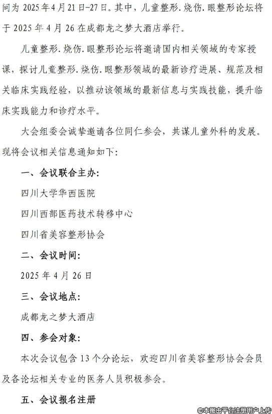 間為 2025年4月21日-27日。其中,兒童整形.燒傷.眼整形論壇將于2025年4月26 在成都龍之夢(mèng)大酒店舉行。