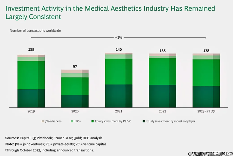 行業(yè)參與者的股權(quán)投資:醫(yī)美公司也進行戰(zhàn)略性股權(quán)投資,收購其他公司的股份,以實現(xiàn)產(chǎn)品組合的多元化并創(chuàng)造協(xié)同效應。例如,生產(chǎn)填充劑的生物再生醫(yī)學公司 CG Bio 最近收購了面部埋線制造商 M.Base,以實現(xiàn)其產(chǎn)品組合的多元化。
