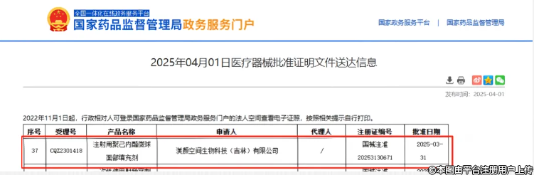 ▲渼?lì)伩臻g旗下“注射用聚己內(nèi)酯微球面部填充劑”正式獲得NMPA批準(zhǔn)(圖源:NMPA)