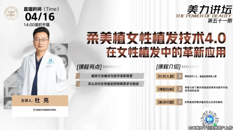 04月16日14:00,美力講壇第五十一期準(zhǔn)時(shí)開播!首瑞女性植發(fā)技術(shù)院長杜亮,帶你解鎖 “柔美植女性植發(fā)技術(shù)4.0”。