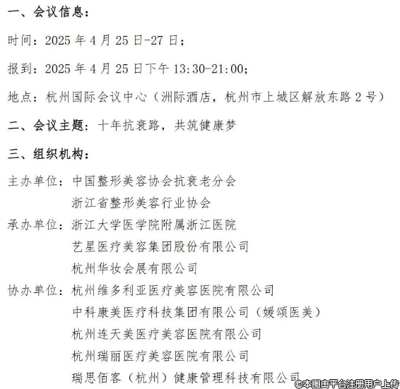 中國(guó)整形美容協(xié)會(huì)抗衰老分會(huì)、浙江省整形美容行業(yè)協(xié)會(huì)將于2025年4月25-27日在杭州國(guó)際會(huì)議中心(杭州洲際酒店)舉辦“第十屆中國(guó)抗衰老醫(yī)學(xué)大會(huì)暨抗衰老產(chǎn)品博覽會(huì)”