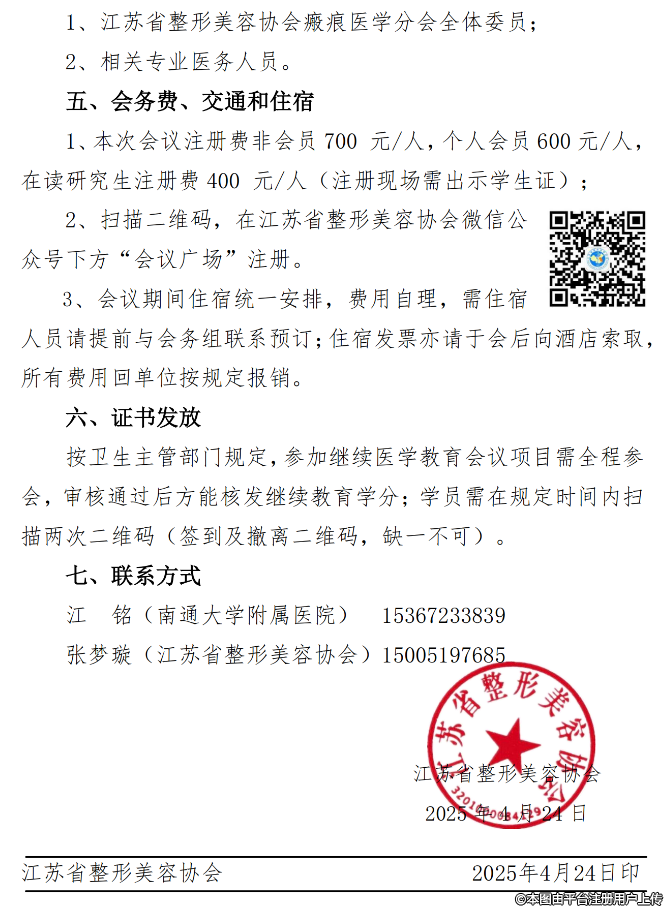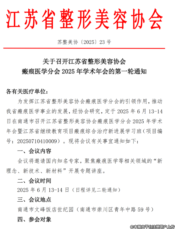 關于召開江蘇省整形美容協(xié)會瘢痕醫(yī)學分會2025年學術年會的第一輪通知