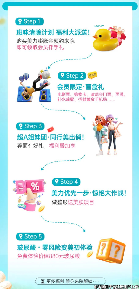 凡是在5月1日-5月5日活動期間,憑美力膨脹金來院核銷顧客,進店即可領(lǐng)取會員限定活動,贏重磅好禮:電影票、100元購物卡、演唱會門票1張、面膜、補水噴霧、招財黃金手機貼、手機支架等
