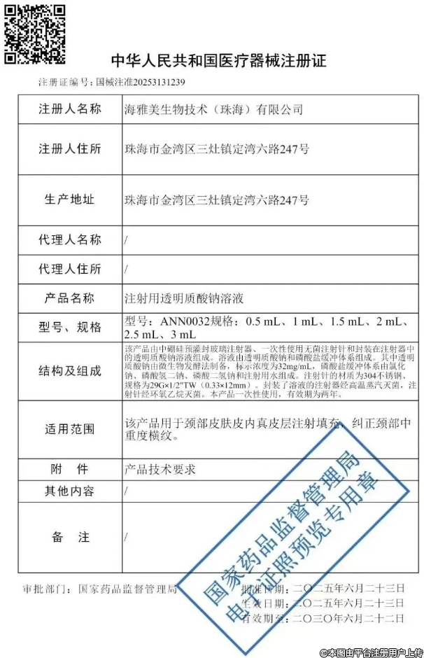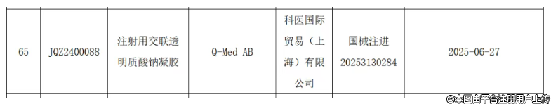 6月27日,高德美旗下注射用交聯(lián)透明質(zhì)酸鈉凝膠獲得國家藥監(jiān)局批準(zhǔn)注冊,注冊證號為國械注進(jìn)20253130284。
