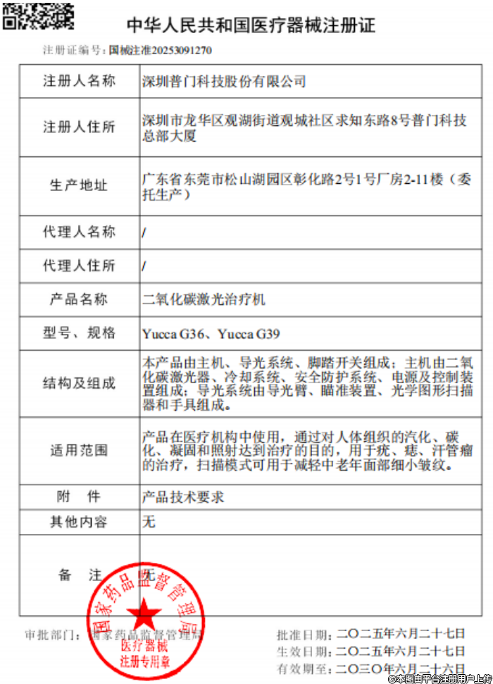 近日,普門科技旗下Ⅲ類醫(yī)療器械「二氧化碳激光治療機(jī)」正式獲得國家藥監(jiān)局批準(zhǔn)上市,國械注準(zhǔn)為20253091270,獲批適應(yīng)癥為“在醫(yī)療機(jī)構(gòu)中使用,通過對人體組織的汽化、碳化、凝固和照射達(dá)到治療的目的,用于疣、痣、汗管瘤的治療,掃描模式可用于減輕中老年面部細(xì)小皺紋。”