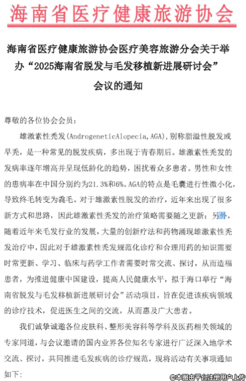 海南省醫(yī)療健康旅游協(xié)會(huì)醫(yī)療美容旅游分會(huì)關(guān)于舉辦“2025海南省脫發(fā)與毛發(fā)移植新進(jìn)展研討會(huì)在”會(huì)議的通知