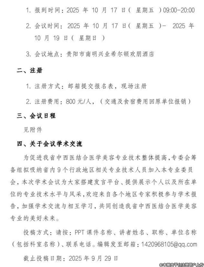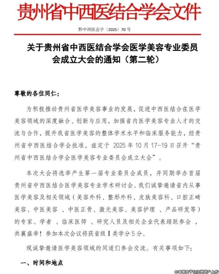 貴州省中西醫(yī)結(jié)合學(xué)會(huì)醫(yī)學(xué)美容專業(yè)委員會(huì)成立大會(huì)擬于2025年10月17-19日在貴陽(yáng)召開