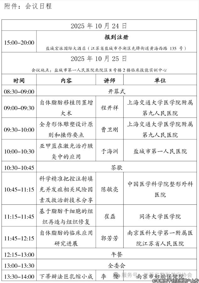 1、會(huì)議同期召開江蘇省整形美容協(xié)會(huì)脂肪醫(yī)學(xué)分會(huì)第一屆二次全委會(huì),江蘇省整形美容協(xié)會(huì)脂肪醫(yī)學(xué)分會(huì)委員請(qǐng)務(wù)必到會(huì)。