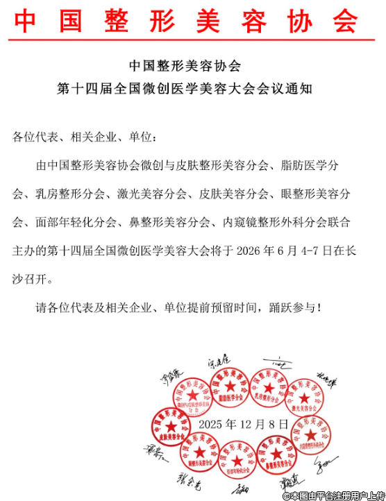 由中國整形美容協(xié)會微創(chuàng)與皮膚整形美容分會、脂肪醫(yī)學(xué)分會、乳房整形分會、激光美容分會、皮膚美容分會、眼整形美容分會、面部年輕化分會、鼻整形美容分會、內(nèi)窺鏡整形外科分會聯(lián)合主辦的第十四屆全國微創(chuàng)醫(yī)學(xué)美容大會將于2026年6月4-7日在長沙召開。