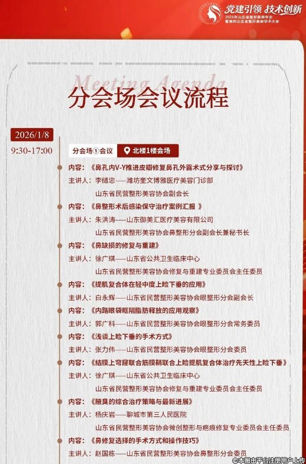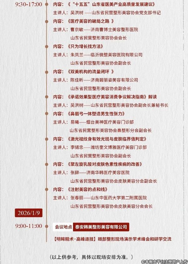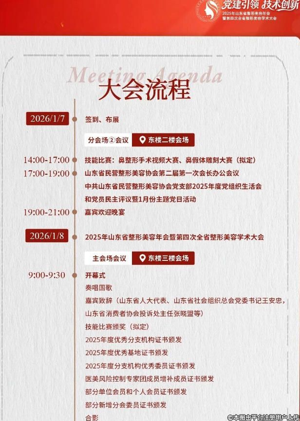 根據(jù)《山東省民營(yíng)整形美容協(xié)會(huì)章程》的規(guī)定,結(jié)合協(xié)會(huì)工作安排,茲定于2026年1月7日-1月9日在泰安召開2025年山東省整形美容年會(huì)暨第四次全省整形美容學(xué)術(shù)大會(huì)。大會(huì)以“黨建引領(lǐng),技術(shù)創(chuàng)新”為主題,共商山東醫(yī)美產(chǎn)業(yè)高質(zhì)量發(fā)展。