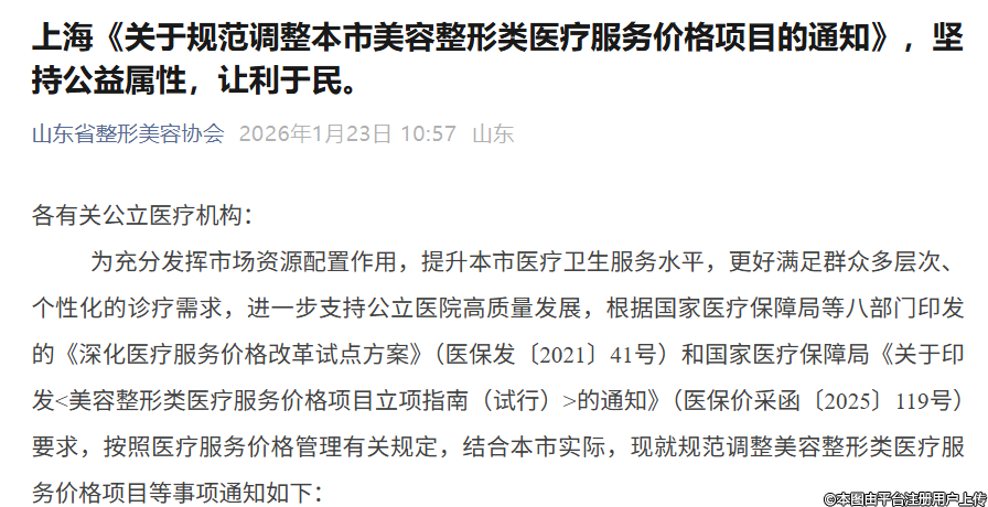 上?!蛾P(guān)于規(guī)范調(diào)整本市美容整形類醫(yī)療服務(wù)價格項目的通知》,堅持公益屬性,讓利于民。