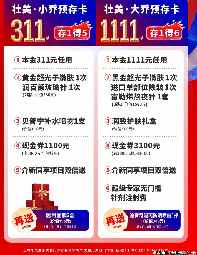 春風(fēng)送暖,顏值煥新!華美第11屆整形美容節(jié)重磅啟幕專為愛(ài)美的你送上春日第一波變美福利??火爆全網(wǎng)的【壯美預(yù)存卡】限時(shí)開搶!沒(méi)有復(fù)雜套路,不用精打細(xì)算,用超親民的價(jià)格,就能安心變美、聰明 “惠” 美!介新同享,福利雙倍送,帶上閨蜜一起變美,兩人都能享超值優(yōu)惠,結(jié)伴變美更劃算、更開心~福利不止于此!
