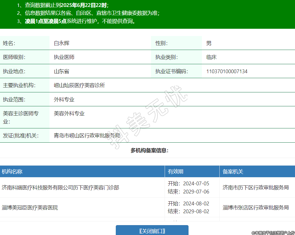 姓名:白永輝性別:男醫(yī)師級別:執(zhí)業(yè)醫(yī)師執(zhí)業(yè)類別:臨床執(zhí)業(yè)地點(diǎn):山東省執(zhí)業(yè)證書編碼:110370100007134主要執(zhí)業(yè)機(jī)構(gòu):嶗山燦辰醫(yī)療美容診所執(zhí)業(yè)范圍:外科專業(yè)美容主診醫(yī)師專業(yè):美容外科專業(yè)發(fā)證(批準(zhǔn))機(jī)關(guān):青島市嶗山區(qū)行政審批服務(wù)局多機(jī)構(gòu)備案信息:機(jī)構(gòu)名稱 有效期 備案機(jī)關(guān) 濟(jì)南科婳醫(yī)療科技服務(wù)有限公司歷下醫(yī)療美容門診部 開始:2024-07-05結(jié)束:2029-07-06濟(jì)南市歷下區(qū)行政審批服務(wù)局 淄博美冠臣醫(yī)療美容醫(yī)院 開始:2024-08-02結(jié)束:2029-08-02淄博市張店區(qū)行政審批服務(wù)局 華美創(chuàng)和醫(yī)療美容(濟(jì)南)有限公司華美創(chuàng)和醫(yī)療美容門診部 開始:2024-08-05結(jié)束:2029-08-06濟(jì)南市市中區(qū)衛(wèi)生健康局 -