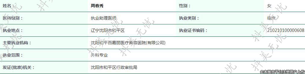 主要執(zhí)業(yè)機(jī)構(gòu):沈陽和平百嘉麗醫(yī)療美容醫(yī)院(有限公司)