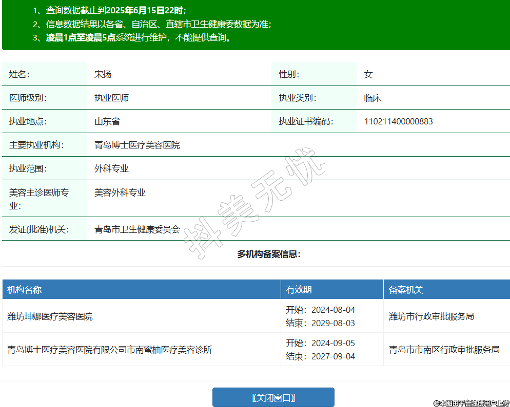 姓名:宋揚(yáng)性別:女醫(yī)師級別:執(zhí)業(yè)醫(yī)師執(zhí)業(yè)類別:臨床執(zhí)業(yè)地點(diǎn):山東省執(zhí)業(yè)證書編碼:110211400000883主要執(zhí)業(yè)機(jī)構(gòu):青島博士醫(yī)療美容醫(yī)院執(zhí)業(yè)范圍:外科專業(yè)美容主診醫(yī)師專業(yè):美容外科專業(yè)發(fā)證(批準(zhǔn))機(jī)關(guān):青島市衛(wèi)生健康委員會多機(jī)構(gòu)備案信息:機(jī)構(gòu)名稱 有效期 備案機(jī)關(guān) 濰坊坤娜醫(yī)療美容醫(yī)院 開始:2024-08-04結(jié)束:2029-08-03濰坊市行政審批服務(wù)局 青島博士醫(yī)療美容醫(yī)院有限公司市南蜜柚醫(yī)療美容診所 開始:2024-09-05結(jié)束:2027-09-04青島市市南區(qū)行政審批服務(wù)局 -