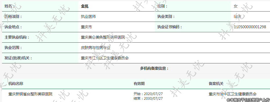 主要執(zhí)業(yè)機構(gòu):重慶美侖美奐整形美容醫(yī)院