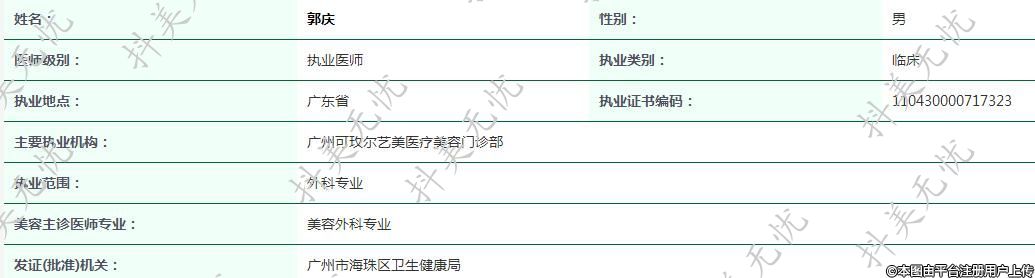 姓名:郭慶性別:男醫(yī)師級別:執(zhí)業(yè)醫(yī)師執(zhí)業(yè)類別:臨床執(zhí)業(yè)地點:廣東省執(zhí)業(yè)證書編碼:110430000717323主要執(zhí)業(yè)機構(gòu):廣州可玫爾藝美醫(yī)療美容門診部執(zhí)業(yè)范圍:口外科專業(yè)美容主診醫(yī)師專業(yè):美容皮膚科專業(yè)發(fā)證(批準(zhǔn))機關(guān):廣州市海珠區(qū)衛(wèi)生健康局文章內(nèi)容來源:國家衛(wèi)生健康委員會 -