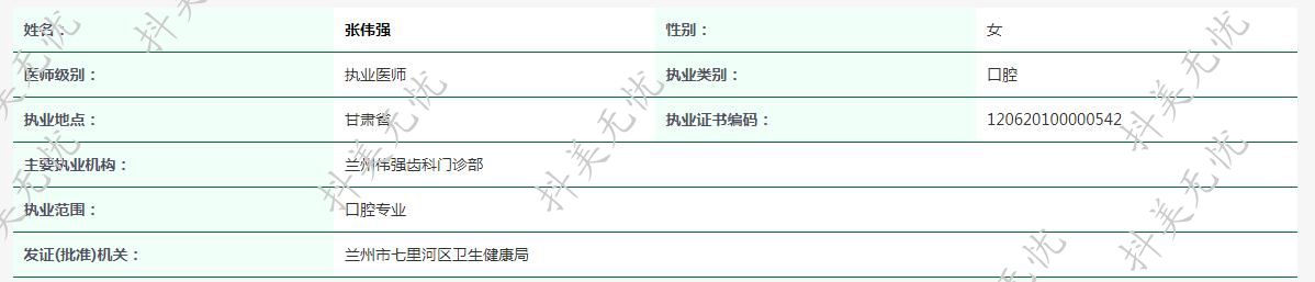 主要執(zhí)業(yè)機構(gòu):蘭州偉強齒科門診部