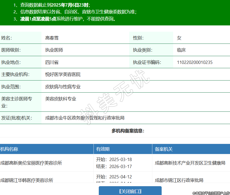 姓名:高春雪性別:女醫(yī)師級(jí)別:執(zhí)業(yè)醫(yī)師執(zhí)業(yè)類別:臨床執(zhí)業(yè)地點(diǎn):四川省執(zhí)業(yè)證書編碼:110220200010235主要執(zhí)業(yè)機(jī)構(gòu):悅好醫(yī)學(xué)美容醫(yī)院執(zhí)業(yè)范圍:皮膚病與性病專業(yè)美容主診醫(yī)師專業(yè):美容皮膚科專業(yè)發(fā)證(批準(zhǔn))機(jī)關(guān):成都市金牛區(qū)政務(wù)服務(wù)管理和行政審批局多機(jī)構(gòu)備案信息:機(jī)構(gòu)名稱 有效期 備案機(jī)關(guān) 成都高新奧倫寶麗醫(yī)療美容診所 開始:2025-03-18結(jié)束:2026-03-17成都高新技術(shù)產(chǎn)業(yè)開發(fā)區(qū)衛(wèi)生健康局 成都錦江華韓醫(yī)療美容診所 開始:2025-04-12結(jié)束:2026-04-11成都市錦江區(qū)行政審批局 -