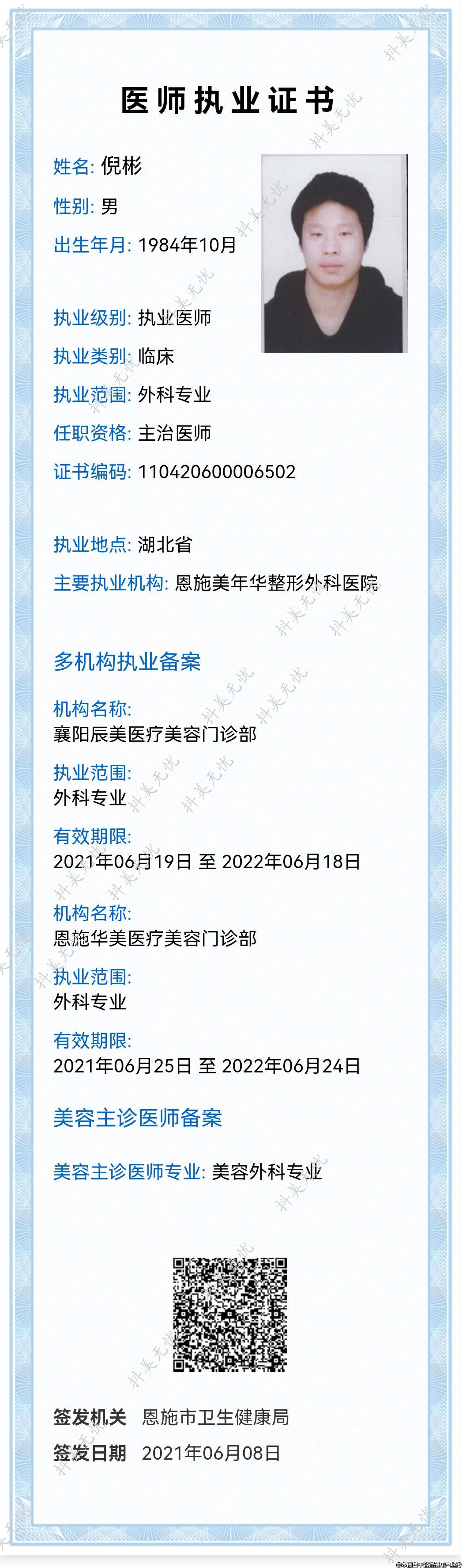 主要執(zhí)業(yè)機(jī)構(gòu):恩施美年華整形外科