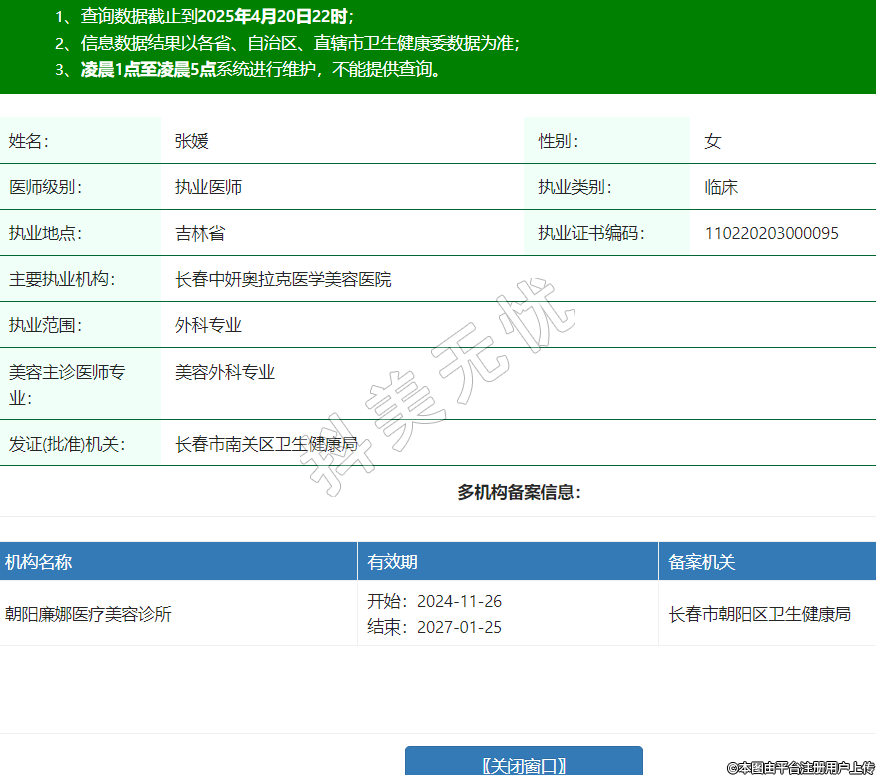 姓名:張媛性別:女醫(yī)師級別:執(zhí)業(yè)醫(yī)師執(zhí)業(yè)類別:臨床執(zhí)業(yè)地點:吉林省執(zhí)業(yè)證書編碼:110220203000095主要執(zhí)業(yè)機構(gòu):長春中妍奧拉克醫(yī)學(xué)美容醫(yī)院執(zhí)業(yè)范圍:外科專業(yè)美容主診醫(yī)師專業(yè):美容外科專業(yè)發(fā)證(批準(zhǔn))機關(guān):長春市南關(guān)區(qū)衛(wèi)生健康局多機構(gòu)備案信息:機構(gòu)名稱 有效期 備案機關(guān) 朝陽廉娜醫(yī)療美容診所 開始:2024-11-26結(jié)束:2027-01-25長春市朝陽區(qū)衛(wèi)生健康局 -
