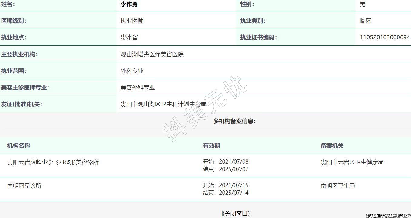 機構名稱:貴陽云巖應超小李飛刀整形美容診所