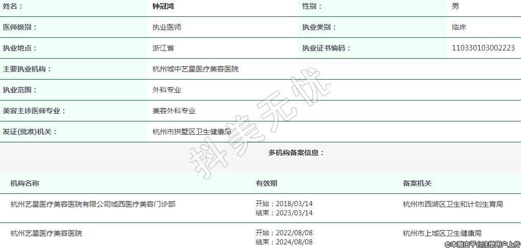 主要執(zhí)業(yè)機構(gòu):杭州城中藝星醫(yī)療美容醫(yī)院