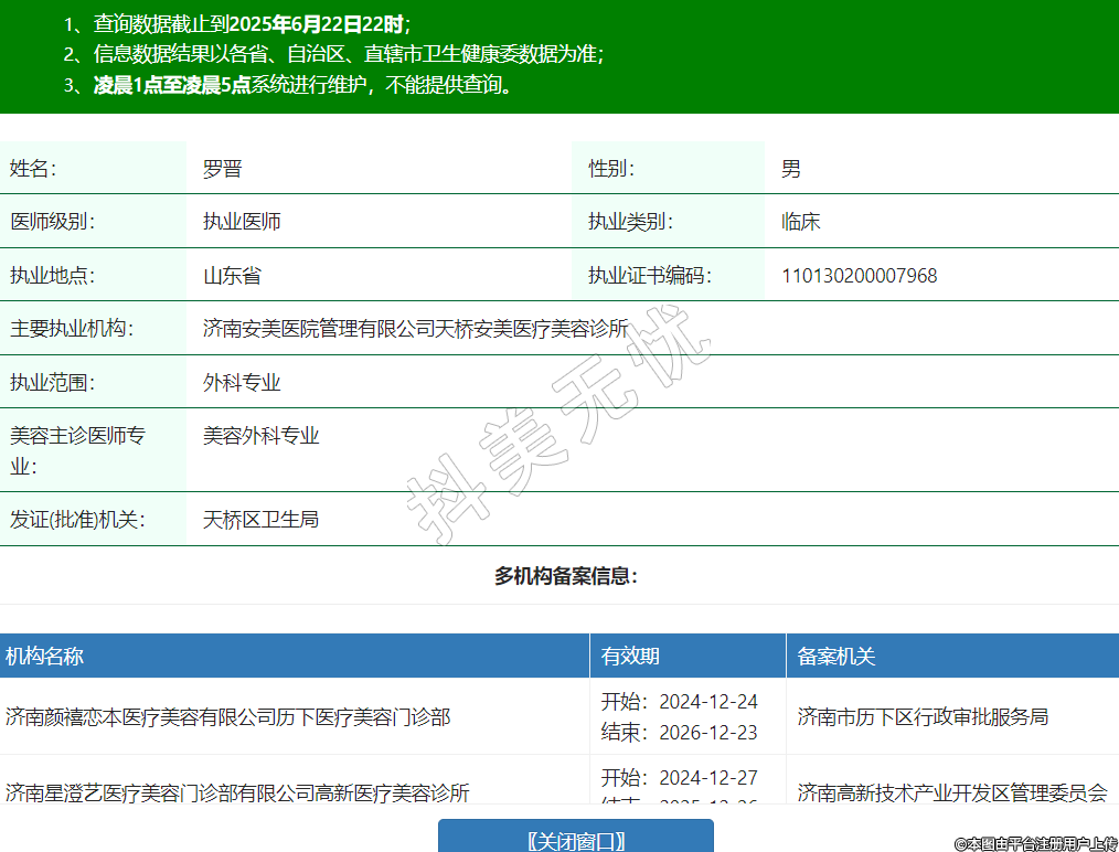 姓名:羅晉性別:男醫(yī)師級別:執(zhí)業(yè)醫(yī)師執(zhí)業(yè)類別:臨床執(zhí)業(yè)地點:山東省執(zhí)業(yè)證書編碼:110130200007968主要執(zhí)業(yè)機(jī)構(gòu):濟(jì)南安美醫(yī)院管理有限公司天橋安美醫(yī)療美容診所執(zhí)業(yè)范圍:外科專業(yè)美容主診醫(yī)師專業(yè):美容外科專業(yè)發(fā)證(批準(zhǔn))機(jī)關(guān):天橋區(qū)衛(wèi)生局多機(jī)構(gòu)備案信息:機(jī)構(gòu)名稱 有效期 備案機(jī)關(guān) 濟(jì)南顏禧戀本醫(yī)療美容有限公司歷下醫(yī)療美容門診部 開始:2024-12-24結(jié)束:2026-12-23濟(jì)南市歷下區(qū)行政審批服務(wù)局 濟(jì)南星澄藝醫(yī)療美容門診部有限公司高新醫(yī)療美容診所 開始:2024-12-27結(jié)束:2025-12-26濟(jì)南高新技術(shù)產(chǎn)業(yè)開發(fā)區(qū)管理委員會 淄博妝典醫(yī)療有限公司張店亞韓醫(yī)療美容門診部 開始:2025-02-13結(jié)束:2026-02-12淄博市張店區(qū)衛(wèi)生健康局 濟(jì)南麗合醫(yī)療美容醫(yī)院 開始:2025-03-20結(jié)束:2026-03-19濟(jì)南市衛(wèi)生健康委員會 濟(jì)南俏嘉麗醫(yī)療美容醫(yī)院有限公司槐蔭俏嘉麗醫(yī)療美容門診部 開始:2025-05-25結(jié)束:2027-05-24濟(jì)南市槐蔭區(qū)行政審批服務(wù)局 濟(jì)南顏禧匯美美容咨詢有限公司歷下醫(yī)療美容診所 開始:2025-05-28結(jié)束:2026-05-27濟(jì)南市歷下區(qū)行政審批服務(wù)局 旭美風(fēng)尚(濟(jì)南)醫(yī)療美容有限公司歷下醫(yī)療美容門診部 開始:2025-05-29結(jié)束:2026-05-28濟(jì)南市歷下區(qū)衛(wèi)生健康局 -