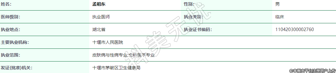 執(zhí)業(yè)范圍:皮膚病與性病專業(yè);全科醫(yī)學(xué)專業(yè)