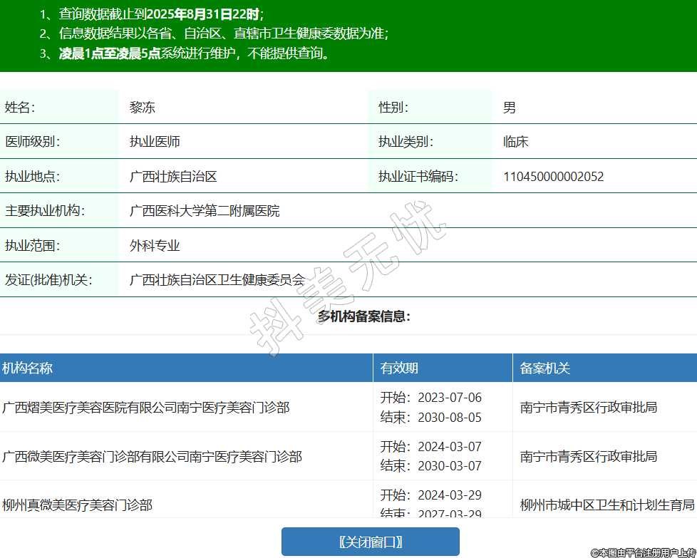 姓名:黎凍性別:男醫(yī)師級別:執(zhí)業(yè)醫(yī)師執(zhí)業(yè)類別:臨床執(zhí)業(yè)地點:廣西壯族自治區(qū)執(zhí)業(yè)證書編碼:110450000002052主要執(zhí)業(yè)機構(gòu):廣西醫(yī)科大學(xué)第二附屬醫(yī)院執(zhí)業(yè)范圍:外科專業(yè)發(fā)證(批準)機關(guān):廣西壯族自治區(qū)衛(wèi)生健康委員會多機構(gòu)備案信息:機構(gòu)名稱 有效期 備案機關(guān) 廣西熠美醫(yī)療美容醫(yī)院有限公司南寧醫(yī)療美容門診部 開始:2023-07-06結(jié)束:2030-08-05南寧市青秀區(qū)行政審批局 廣西微美醫(yī)療美容門診部有限公司南寧醫(yī)療美容門診部 開始:2024-03-07結(jié)束:2030-03-07南寧市青秀區(qū)行政審批局 柳州真微美醫(yī)療美容門診部 開始:2024-03-29結(jié)束:2027-03-29柳州市城中區(qū)衛(wèi)生和計劃生育局 玉林微美醫(yī)療美容門診有限公司玉林醫(yī)療美容門診部 開始:2024-04-23結(jié)束:2027-04-23玉林市衛(wèi)生健康委員會 貴港市港北區(qū)人民醫(yī)院 開始:2024-05-01結(jié)束:2027-05-01貴港市衛(wèi)生健康委員會 南寧顏值密碼醫(yī)療美容門診部 開始:2024-08-26結(jié)束:2034-08-26南寧市青秀區(qū)行政審批局 廣西安和美雅醫(yī)院有限公司南寧綜合門診部 開始:2025-06-27結(jié)束:2030-06-26南寧市青秀區(qū)政務(wù)服務(wù)局 廣西亞太醫(yī)療美容醫(yī)院 開始:2025-07-23結(jié)束:2030-07-22南寧市政務(wù)服務(wù)局 南寧星范醫(yī)療美容門診部 開始:2025-08-12結(jié)束:2035-08-09南寧市青秀區(qū)政務(wù)服務(wù)局 -