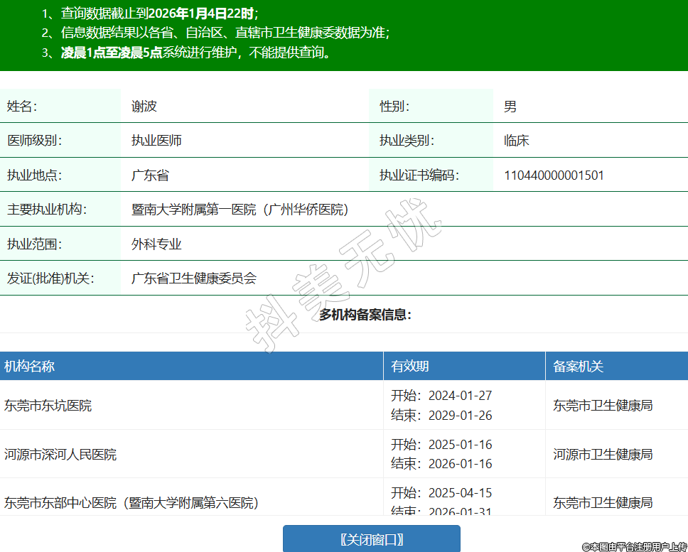 姓名:謝波性別:男醫(yī)師級(jí)別:執(zhí)業(yè)醫(yī)師執(zhí)業(yè)類別:臨床執(zhí)業(yè)地點(diǎn):廣東省執(zhí)業(yè)證書編碼:110440000001501主要執(zhí)業(yè)機(jī)構(gòu):暨南大學(xué)附屬第一醫(yī)院(廣州華僑醫(yī)院)執(zhí)業(yè)范圍:外科專業(yè)發(fā)證(批準(zhǔn))機(jī)關(guān):廣東省衛(wèi)生健康委員會(huì)多機(jī)構(gòu)備案信息:機(jī)構(gòu)名稱 有效期 備案機(jī)關(guān) 東莞市東坑醫(yī)院 開始:2024-01-27結(jié)束:2029-01-26東莞市衛(wèi)生健康局 河源市深河人民醫(yī)院 開始:2025-01-16結(jié)束:2026-01-16河源市衛(wèi)生健康局 東莞市東部中心醫(yī)院(暨南大學(xué)附屬第六醫(yī)院) 開始:2025-04-15結(jié)束:2026-01-31東莞市衛(wèi)生健康局 深圳普瑞星耀眼科醫(yī)院 開始:2025-08-11結(jié)束:2028-08-10深圳市衛(wèi)生健康委員會(huì) -