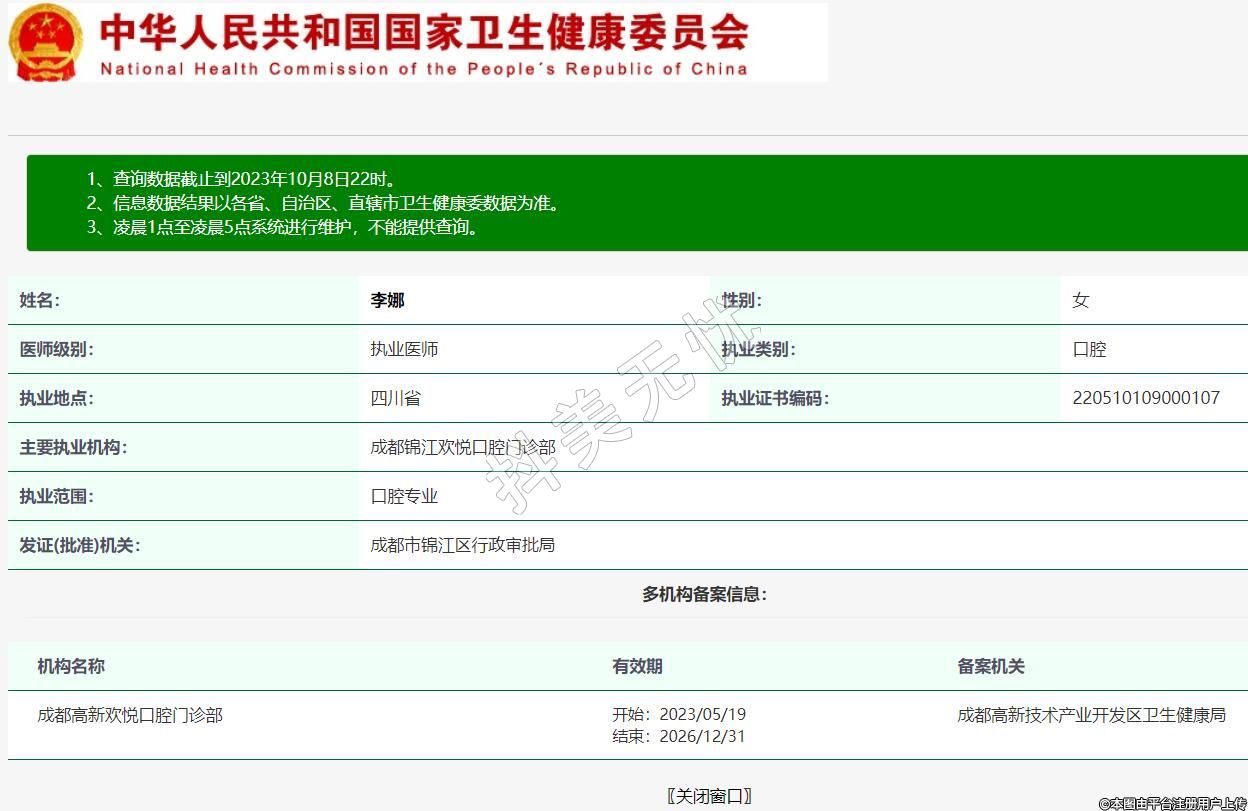 主要執(zhí)業(yè)機(jī)構(gòu):成都錦江歡悅口腔門診部