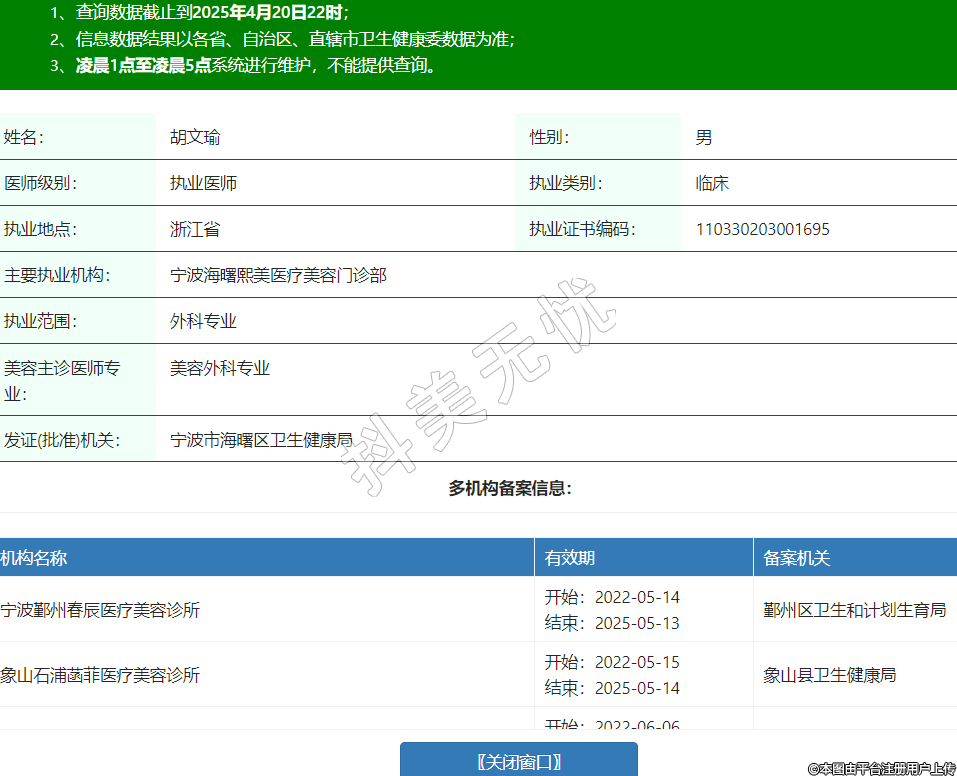 姓名:胡文瑜性別:男醫(yī)師級別:執(zhí)業(yè)醫(yī)師執(zhí)業(yè)類別:臨床執(zhí)業(yè)地點:浙江省執(zhí)業(yè)證書編碼:110330203001695主要執(zhí)業(yè)機構:寧波海曙熙美醫(yī)療美容門診部執(zhí)業(yè)范圍:外科專業(yè)美容主診醫(yī)師專業(yè):美容外科專業(yè)發(fā)證(批準)機關:寧波市海曙區(qū)衛(wèi)生健康局多機構備案信息:機構名稱 有效期 備案機關 寧波鄞州春辰醫(yī)療美容診所 開始:2022-05-14結束:2025-05-13鄞州區(qū)衛(wèi)生和計劃生育局 象山石浦菡菲醫(yī)療美容診所 開始:2022-05-15結束:2025-05-14象山縣衛(wèi)生健康局 衢州市柯城區(qū)桂美人醫(yī)療美容門診部(普通合伙) 開始:2022-06-06結束:2027-06-05衢州市柯城區(qū)衛(wèi)生健康局 寧波江北尚麗醫(yī)療美容門診部 開始:2023-08-31結束:2026-08-31寧波市江北區(qū)衛(wèi)生健康局 桐廬韓加醫(yī)療美容門診部 開始:2024-03-06結束:2027-03-04桐廬縣衛(wèi)生健康局 寧波江北外灘纖姿醫(yī)療美容門診部 開始:2024-05-21結束:2027-06-20寧波市江北區(qū)衛(wèi)生健康局 嘉興畫美醫(yī)療美容診所 開始:2024-12-02結束:2027-12-01嘉興市南湖區(qū)衛(wèi)生健康局 寧波海曙初美星范醫(yī)療美容門診部 開始:2025-04-09結束:2028-04-08寧波市海曙區(qū)衛(wèi)生健康局 -