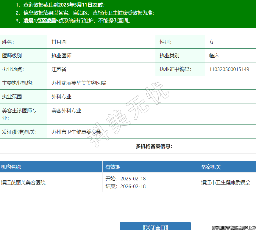 姓名:甘月圓性別:女醫(yī)師級(jí)別:執(zhí)業(yè)醫(yī)師執(zhí)業(yè)類別:臨床執(zhí)業(yè)地點(diǎn):江蘇省執(zhí)業(yè)證書編碼:110320500015149主要執(zhí)業(yè)機(jī)構(gòu):蘇州芘麗芙華美美容醫(yī)院執(zhí)業(yè)范圍:外科專業(yè)美容主診醫(yī)師專業(yè):美容外科專業(yè)發(fā)證(批準(zhǔn))機(jī)關(guān):蘇州市衛(wèi)生健康委員會(huì)多機(jī)構(gòu)備案信息:機(jī)構(gòu)名稱 有效期 備案機(jī)關(guān) 鎮(zhèn)江芘麗芙美容醫(yī)院 開始:2025-02-18結(jié)束:2026-02-18鎮(zhèn)江市衛(wèi)生健康委員會(huì) -